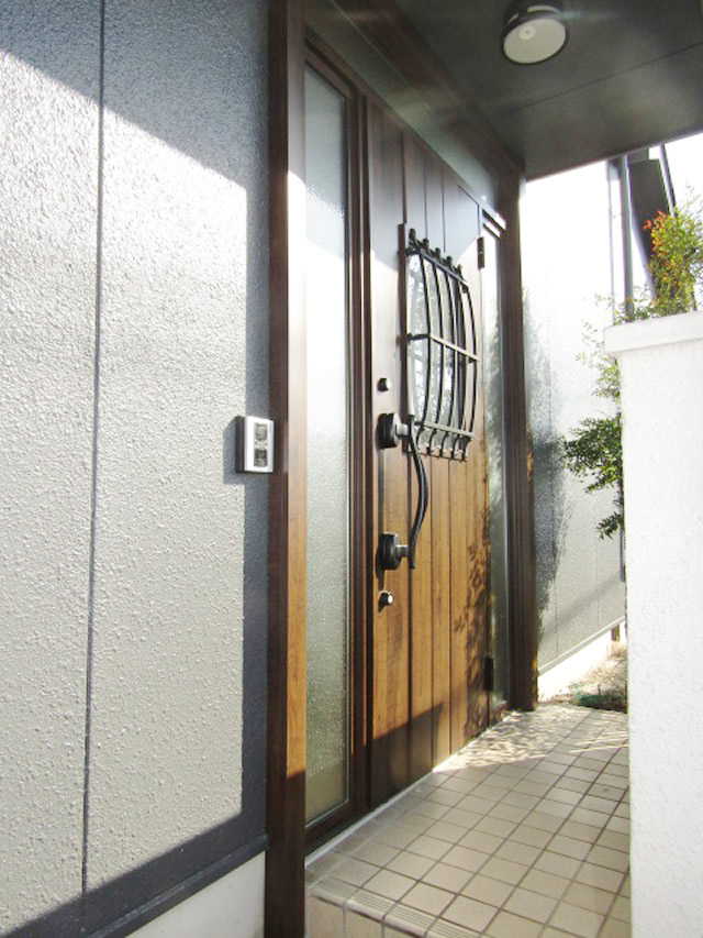 LIXIL製品「リシェント」による玄関ドアD44型へ取り替えました。両袖とランマ部分には防犯合わせガラスを使用しています。既存の玄関枠に新しい玄関ドアの枠をはめ込む「カバー工法」により、1日で新しい玄関ドアに生まれ変わりました。断熱仕様のため冬でも暖かく保てます。