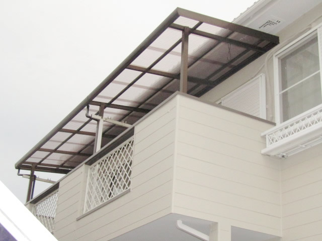 台風で2階ベランダのテラスの波板屋根が一部飛んでしまったため、張り替えのご依頼をいただきました。
