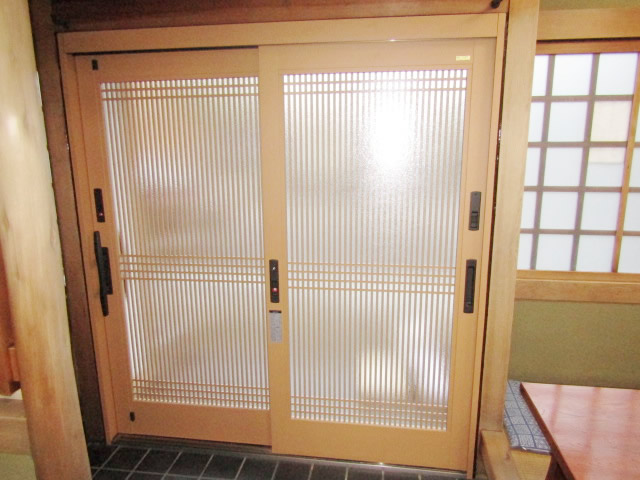 既設は片開きドアでしたが、LIXIL製品クリエラガラスドア親子仕様へ取り替え施工しました。上部はアクリル半透明パネルを使用、重量がとても軽くなりました。